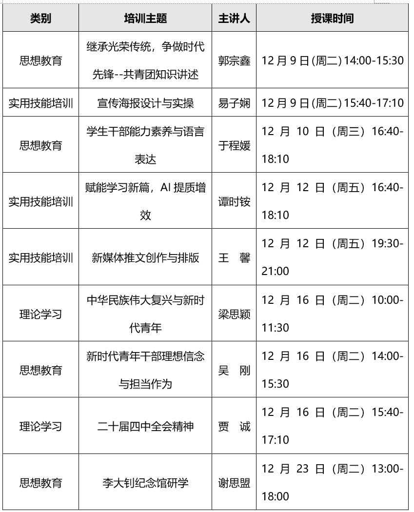 2025年青年马克思主义者培养工程骨干培训班实施方案》,经统筹安排,现将本期青马工程骨干培训班集中培训的具体课程时间及要求通知如下: